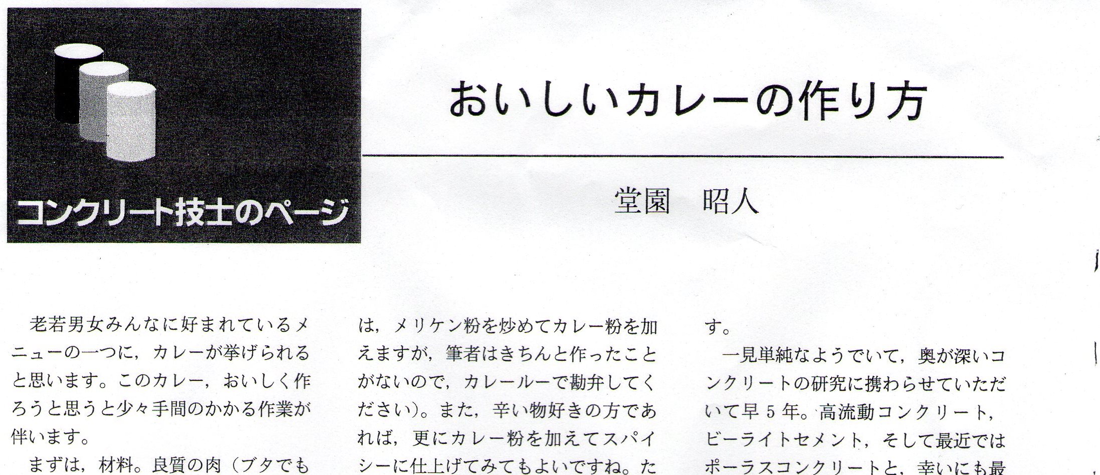 コンクリートの学術雑誌に、馬鹿正直にカレーの作り方などが掲載されるはずはないと思っていた。カレーの作り方というのはきっと何かの比喩にすぎず、本文を読めば、何かしら深遠で普遍的で、古今東西、老若男女の琴線に触れる高邁な哲学的考察が繰り広げられているのだろうと期待して書庫から取り寄せた。