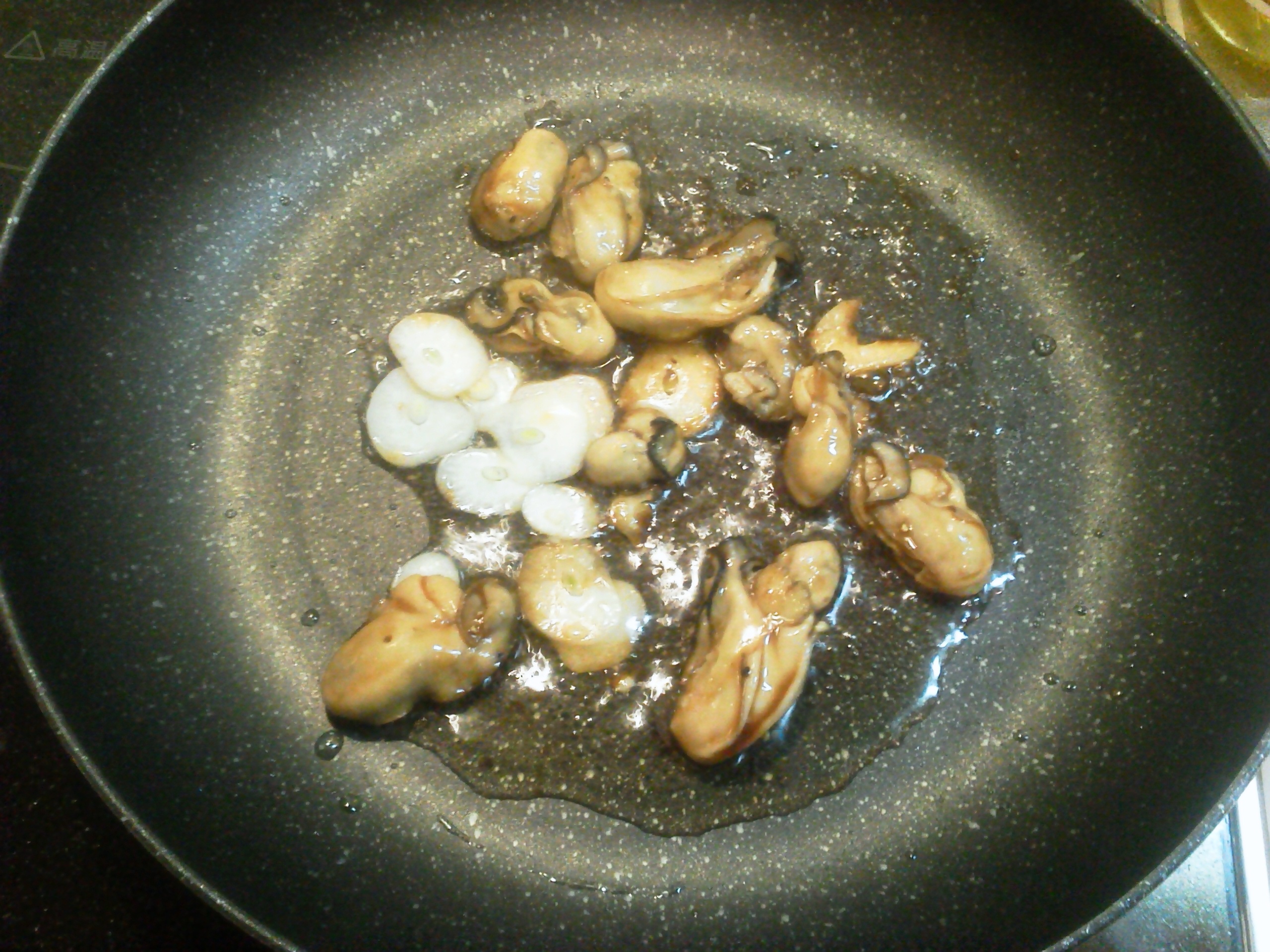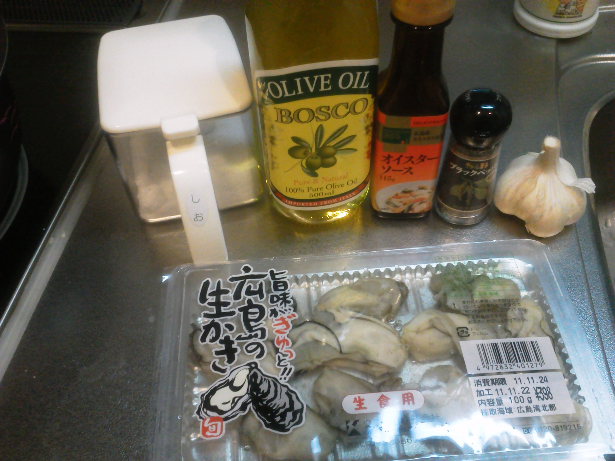 生牡蠣、塩、ピュアオリーブオイル、オイスターソース、黒胡椒、にんにく