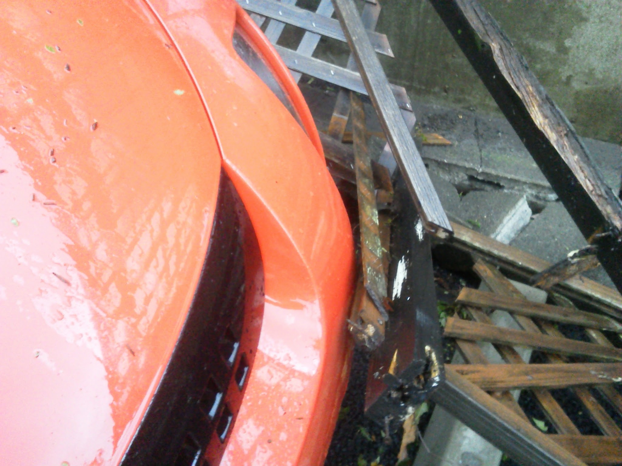 強烈な風雨なので、まだきちんと確認していないが、幸いにしてブロック部分の命中は避けられた模様。そのかわり、塀の木製部分が車のフロントにあたっている。